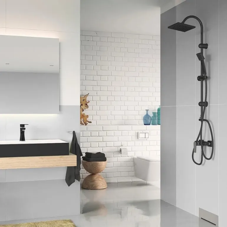 В-третьих, стильный чёрный цвет и строгая геометрия стойки превращают обычную ванную в современное пространство, где всё продумано до мелочей.